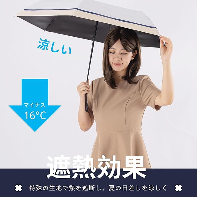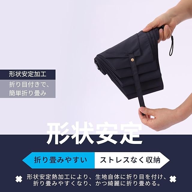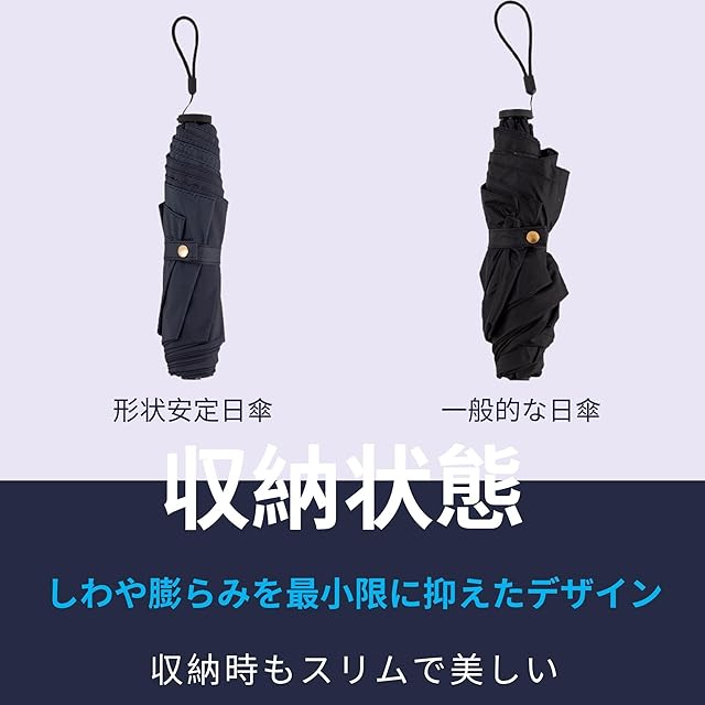 【形状安定加工、収納を便利に】 特殊な熱加工による形状安定加工が施された日傘は、生地そのものに折り目を付けることで、使い終わった後の折り畳みがスムーズになります。(完全遮光の日傘は、生地が厚いため、傘をたたむ際に折り目をある程度手で整える必要があります。)また、熱加工でしわや膨らみを最小限に抑えることで、いつでも美しいシルエットを保ちます。
