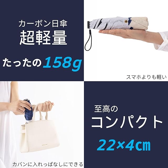 【超軽量&コンパクト・持ち運びに便利】収納時はわずか22cmで、重さは驚きの約158g。カーボンファイバーを使用した超軽量設計で、毎日の携帯に最適です。ポケットにもすっぽり収まるコンパクトサイズなので、カバンやハンドバッグに入れてもかさばりません。通勤・通学、外出時にいつでも手軽に持ち運べる、負担にならず、快適な折り畳み日傘です。