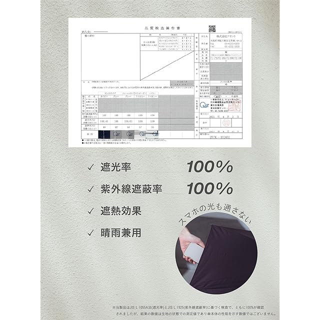(※)当製品はJIS L 1055A法(遮光率)とJIS L 1925(紫外線遮蔽率)に基づく検査で、ともに100%が確認されましたが、結果の数値は生地の状態での測定値であり傘本体の性能を示す数値ではございません。