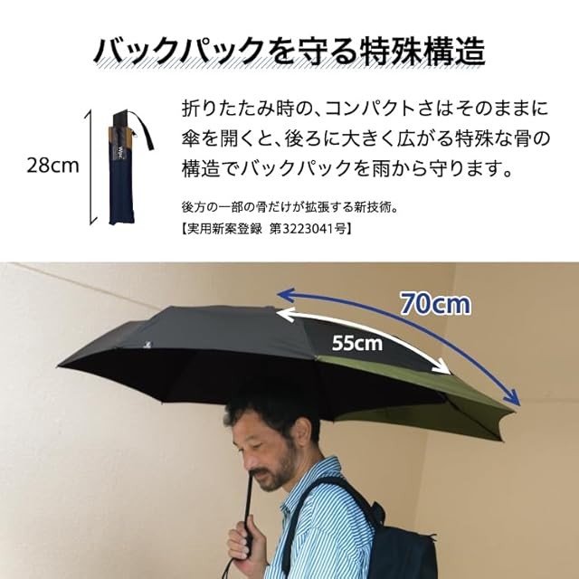 Wpc. [リュックが濡れない] 折りたたみ傘 BACK PROTECT FOLDING カーキ×ブラック 雨傘 晴雨兼用 55cm 大きい メンズ 男性 バックパック 後ろが長い 通勤 通学 シンプル おしゃれ UX004-933-002