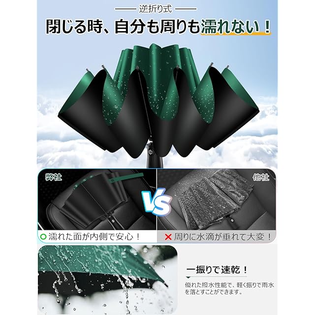 超人気濡れない「逆折り式傘」。☂【濡れない逆折り式傘&カバー付き】通常の傘は濡れた部分が外側になりますが、逆折り式傘は、閉じたときに濡れた部分が内側になるというユニークな傘。手が濡れない傘として大人気です。閉じる際に手が濡れにくく、人混みや電車の中でも、まわりが濡れないように気を遣う必要がないです。衣服・荷物・車のシートなどを濡らしたくないときにも便利です。さらに、高撥水生地を採用し、水をはじきやすく、軽く振るだけで雨水を落とすことができます。カバーや袋付きなので、使用後すぐにカバンに収納できます。ホコリや汚れから傘をガードできるほか、使ったばかりの傘をしまっても服やバッグを濡らしません。より一層便利さが進化した折り畳み傘です。電車やバスなど公共交通機関を利用する方におすすめです。