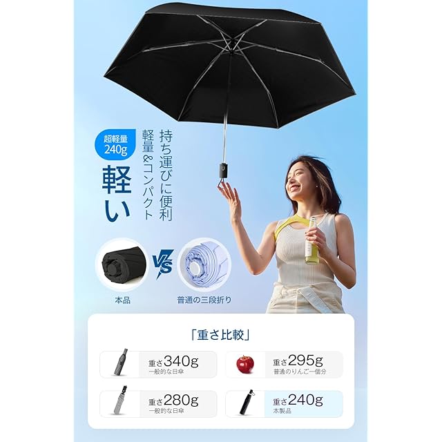【超軽量・持ち運び日傘】軽くて丈夫なグラスファイバー親骨とアルミ合金中棒を採用し、通常より軽量化され、重さ240g、折り畳んだらわずか4cmとスリムサイズ、バッグにかさばらずにすっぽり入り、携帯に便利な折り畳み日傘です。通学通勤など毎日持ち歩いても負担にならない、夏フェス、スポーツ観戦、野外イベント、ライブ、キャンプ、登山、遠足、旅行、アウトドア活動など、屋外でも快適に過ごせる暑さ対策グッズとして大変重宝されます。