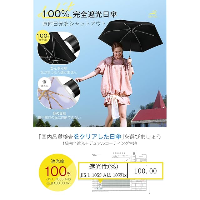 【100%UVカット・完全遮光】遮光フィルムを生地にボンディングした多層生地設計を採用し、JIS認証済みの遮光率&UVカット率ともに100%・UPF50+日傘です。デュアルコーティングを施され、表側が直射日光をしっかりシャットアウトし、裏側が黒で光を通さず、地面からの照り返しを顔に当たらないように吸収しながら、まぶしい感じを軽減します。日傘をさして熱線となる太陽光線をカットすることで、ジリジリ日差しの中を歩いても、日陰ができたみたいに暑さをやわらげて、暑い季節に欠かせない夏対策グッズです。