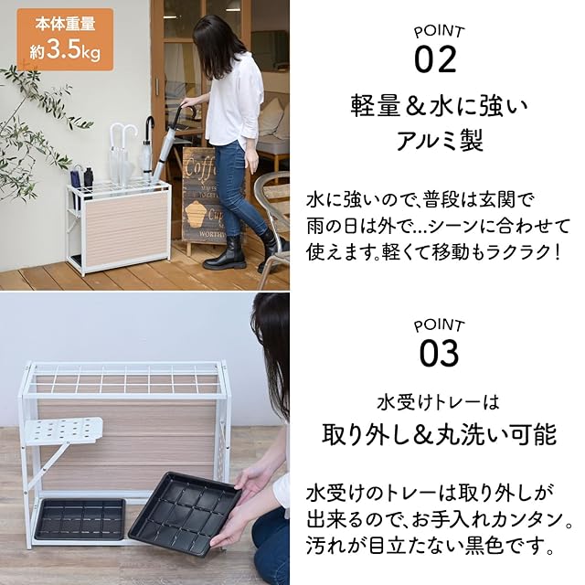 【軽量で水に強いアルミ製】アルミ製で軽く、移動もさせやすいです。水に強いので、雨の日はドアの外に置いて濡れた傘を玄関に持ち込まずに使うなどシーンに合わせてお使い頂けます。