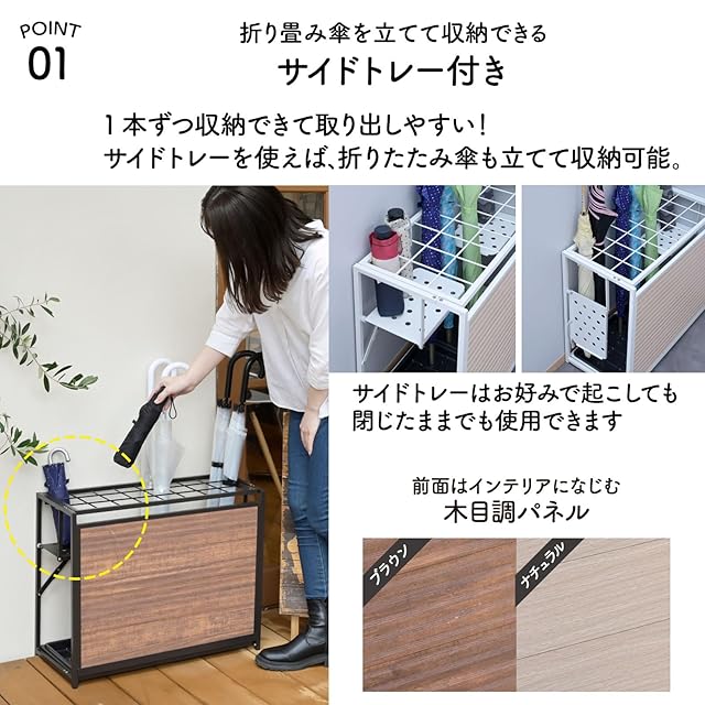 【折りたたみ傘も収納可能】長傘を24本収納可能な傘立てです。折りたたみ傘用の棚が付いているので、折りたたみ傘も横倒しになることなく、すっきり立てて収納できます(棚は1つあたり6マス分です)。折りたたみ傘用棚を起こして、または畳んだままのどちらでも使用可能なので、置く傘によって変えられます。