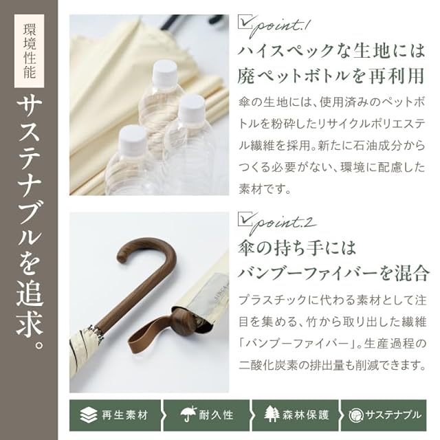 【環境にやさしいサステナブルな素材】 生地には廃ペットボトルを再資源化した再生ポリエステルを、持ち手にはバンブーファイバーを使用。