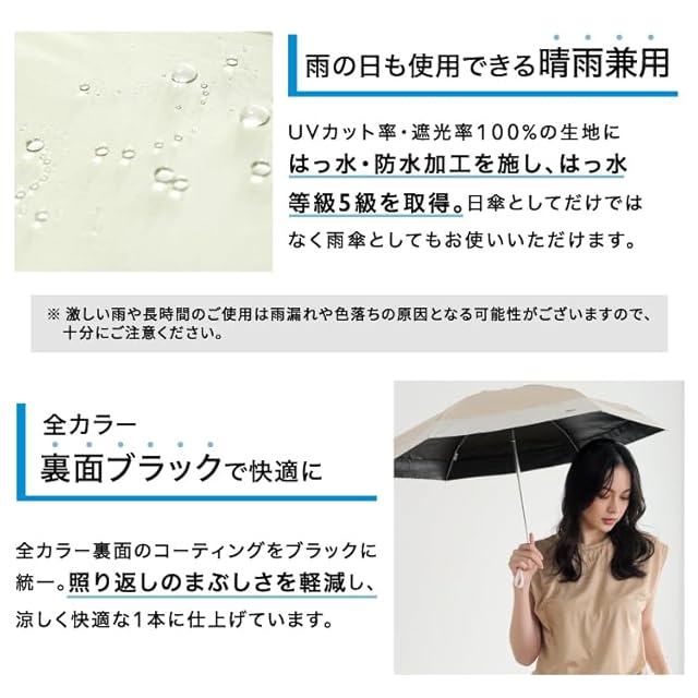 【雨の日も使える日傘(晴雨兼用)】 この製品は日傘としてお使い頂くことを主としていますが、はっ水防水加工を施しているため雨傘としてもお使いいただけます。 ※激しい雨や長時間の雨傘としてのご使用は雨漏りや色落ちの原因となる可能性がございます。 またデザインの特性上、完全な防水はっ水加工が難しい場合があり、雨が染み込むことがありますのでご注意ください。