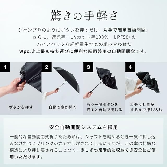 【驚きの手軽さ】ジャンプ傘のようにボタンを押して自動開閉するため、片手が塞がっていてもパッと開きやすい。 自動開閉でありながら、収納時サイズは約23×6×4cmと驚きのコンパクトさ。 さらに軽量化も実現しており 「自動開閉は便利だけど重くて大きい・・・」と感じている方にぜひ使っていただきたい自動開閉傘です。