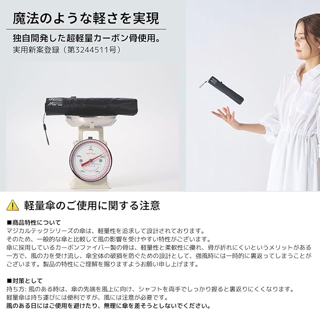 ※軽量製品の特性について:マジカルテックシリーズの傘は、軽量性を追求して設計されております。そのため、一般的な傘と比較して風の影響を受けやすい特性がございます。傘に採用しているカーボンファイバー製の骨は、軽量性と柔軟性に優れ、骨が折れにくいというメリットがある一方で、風の力を受け流し、傘全体の破損を防ぐための設計として、一時的に裏返ってしまうことがございます。製品の特性にご理解賜りますようお願いいたします。※傘の差し方について:風のある時は、傘の先端を風上に向け、シャフトを両手でしっかり握ると裏返りにくくなります。風のある日にはご使用を避けたり、無理に傘を差そうとしないようにしてください。