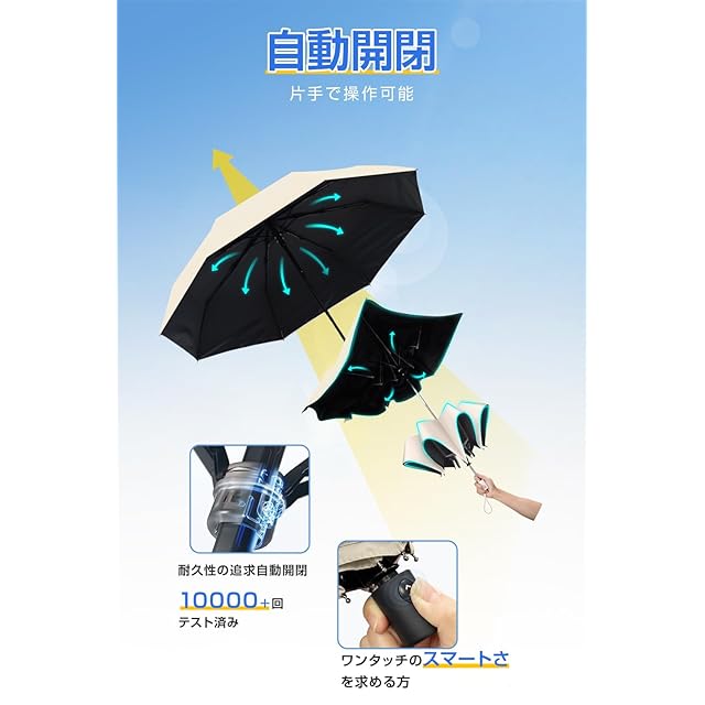 【ワンタッチ自動開閉式・使用簡単】片手で簡単に開閉できる自動開閉式の折りたたみ日傘です。車の乗り降りや荷物が多い時にも便利で、女性に最適なデザインです。強い日差しには、ボタンを押すだけで傘が開き、紫外線からしっかり守ります。通勤や通学はもちろん、スポーツ観戦、夏フェス、イベント、キャンプ、遠足、アウトドア、旅行など、紫外線を気にせずに夏を楽しむことができます。