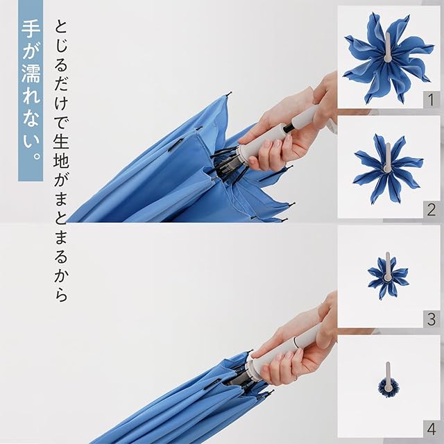 【手を濡らさず、一瞬でまとまる傘】傘をとじたあと、手でまとめて、ベルトで留める。手が濡れてしまうのは、当たりまえ。そんな煩わしさを無くし「たたまなくていい。」「手が濡れない。」を実現。とじるだけで、生地がまとまる新しい傘が生まれました。【ご注意】傘をしまう際は、広げて湿気を十分に取り除いてください。濡れた傘をそのまま保管したり乾燥が不十分なまま収納すると、傘骨が錆びたり生地が変色したり色移りすることがあります。