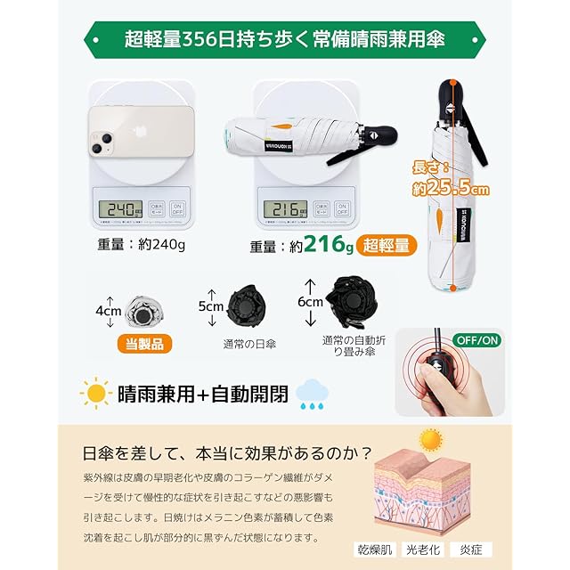 【晴雨兼用】210T高密度NC布を使用して、テフロン加工が施されています、傘布上のナノテクノロジー防水加工、通常の折りたたみ式日傘よりも優れた防水機能、雨滴は自動的に傘布で滑り落ちます。雨の後は、水滴を簡単に振り落とすことができます。路面電車などの公共の場所では、他の人に迷惑をかけることはできません。これは他の日傘のパフォーマンスです。それは光と撥水性の両方と超高速乾燥機能を持っています。本物の雨と雨が一緒になって、バッグに入れても心配ありません。