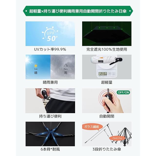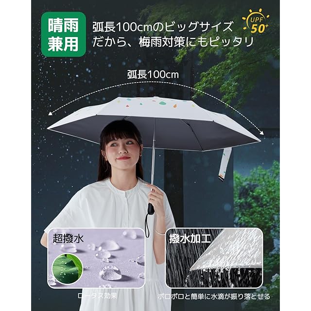 【晴雨兼用】280T高密度NC布を使用して、テフロン加工が施されています、傘布上のナノテクノロジー防水加工、通常の折りたたみ式日傘よりも優れた防水機能、雨滴は自動的に傘布で滑り落ちます。雨の後は、水滴を簡単に振り落とすことができます。路面電車などの公共の場所では、他の人に迷惑をかけることはできません。これは他の日傘のパフォーマンスです。それは光と撥水性の両方と超高速乾燥機能を持っています。本物の雨と雨が一緒になって、バッグに入れても心配ありません。