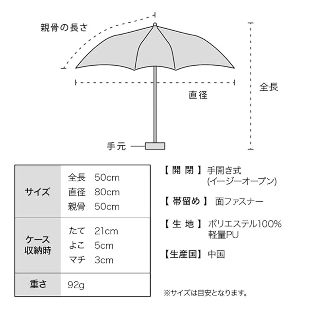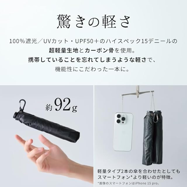 【驚きの軽さ 約92g】ハイスペック15デニールの超軽量生地とカーボン骨を使用した、Wpc. 史上最も軽い晴雨兼用傘。 親骨50cmの定番サイズで、収納時サイズは約21×3cm。 小さなバッグや、ビジネスバッグの隙間にもすっと収まり、持ち運びもノンストレス。