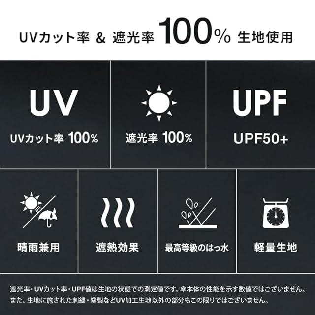 【最高等級の遮熱・遮光・遮蔽率】 15デニールのとても薄い生地でありながら、傘の専用メーカーとして長年培ったノウハウを集約し、生地の品質を保っています。 生地裏面にポリウレタン樹脂コーティングを施すことで、遮光率/遮蔽率は100%、UPF値50+の最高等級、遮熱効果も兼ね備え、日傘にとって必要な機能もハイレベルで実現しています。