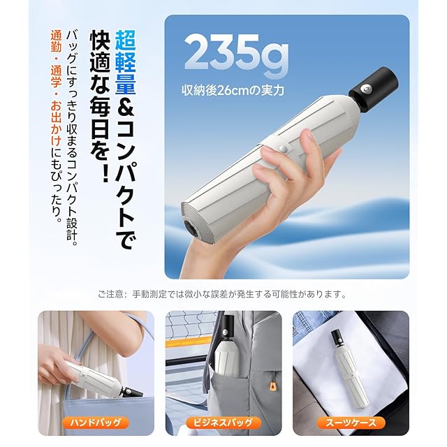 【365日持ち歩きたくなる極上コンパクト日傘】SILVLFのおりたたみ傘は、最先端テクノロジーを結集した235gの超軽量ボディ!航空宇宙技術にも使われる高強度ガラスファイバーと航空機用アルミ合金のハイブリッドフレームを採用し、驚異的な軽さと強度を両立。収納時わずか3.5cmの超スリム設計は、ビジネススーツの内ポケットにもすっぽり収まるほど。通勤・通学はもちろん、旅行やスポーツ、ショッピングなど、あらゆるシーンで「持ってて良かった」と思える使い心地です。
