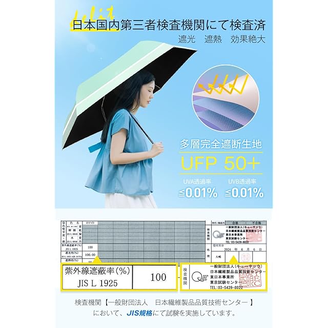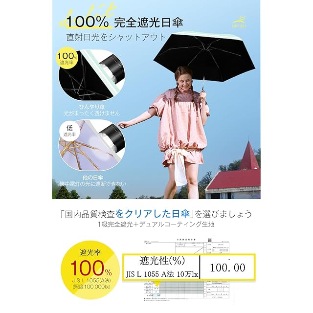 【100%UVカット・完全遮光】遮光フィルムを生地にボンディングした多層生地設計を採用し、JIS認証済みの遮光率&UVカット率ともに100%・UPF50+日傘です。デュアルコーティングを施され、表側が直射日光をしっかりシャットアウトし、裏側が黒で光を通さず、地面からの照り返しを顔に当たらないように吸収しながら、まぶしい感じを軽減します。日傘をさして熱線となる太陽光線をカットすることで、ジリジリ日差しの中を歩いても、日陰ができたみたいに暑さをやわらげて、暑い季節に欠かせない夏対策グッズです。