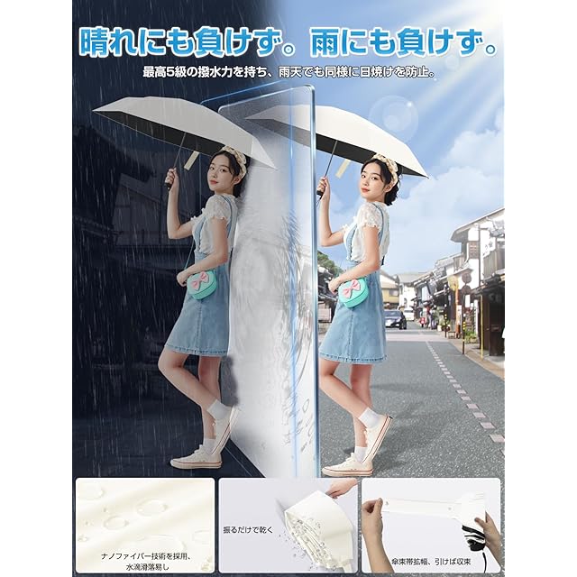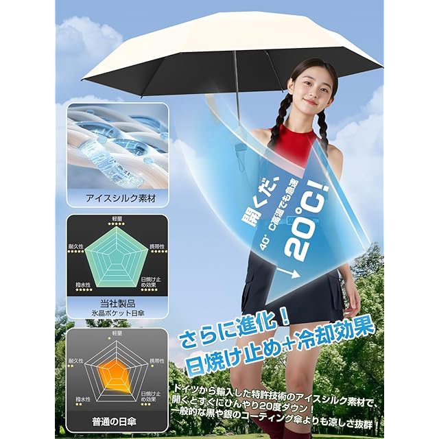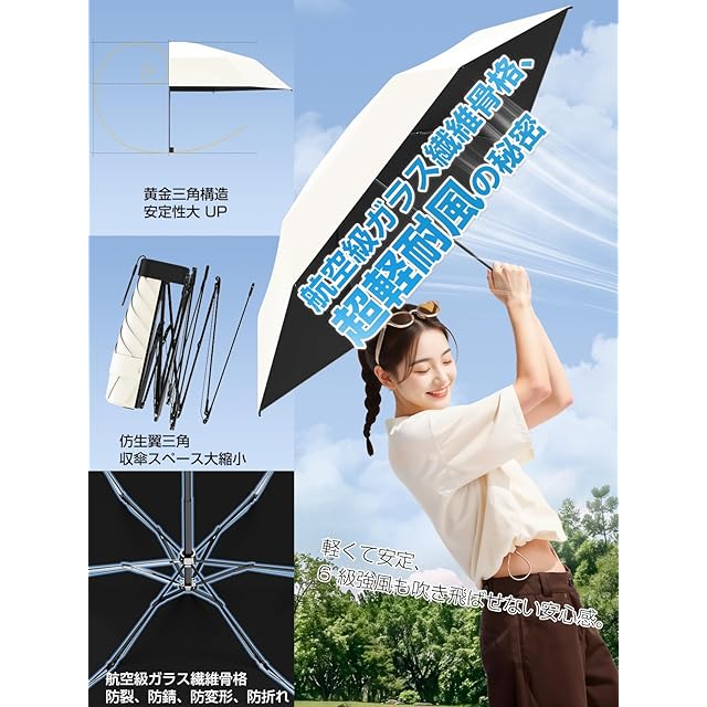 【100% 紫外線防止 & 100% 遮光・遮熱日傘】 特殊なコーティング技術と素材を使用し、100% の紫外線遮断性能を実現しています。有害な紫外線を完全に遮り、肌を日焼けや老化から守り、健康な肌を維持するために役立ちます。100% の遮光・遮熱機能も備えています。日差しの強い日にも傘を開けるだけで涼しさを感じられ、太陽の光と熱を効果的に遮断して、快適な空間を作り出します。