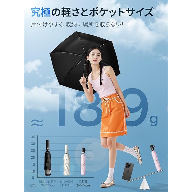 【コンパクト・超軽量・晴雨兼用・耐風撥水】おりたたみ日傘フラットなデザインで、バッグに簡単に入れることができます。折りたたんだ厚さはわずか4cm、長さは25.5cm、重さは約188g、毎日の持ち運びに最適! 通勤・通学、旅行、ハイキング、スポーツなど、あらゆるシーンで幅広く利用でき、老若男女問わず幅広い世代の方々にご利用いただけます!繊維ナノテクノロジーを採用し、310T 高密度の傘生地を使用しています。雨滴が落下しても丸くなって転がり落ち、長期使用しても染み込みません。撥水性は抜群で、軽く振ればすぐに乾き、バッグに入れることができます。航空機級のアルミ合金とグラスファイバー製の傘骨は、錆びにくく、変形しにくく、高強度と柔軟性を兼ね備えています。安定性と耐久性が大幅に向上しています!