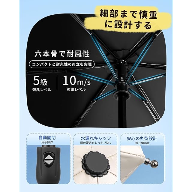 【晴雨兼用☂ 耐風撥水】310T高密度生地が、雨が珠のように丸くなり転がり落ちます。普通の折畳み傘より撥水性が優れ、軽く振るだけで雨水を振り払えます。長い間使用しても雨の染み込みが気にならなくなりました。電車内等の公共の場では人にご迷惑を掛けません。こちらの折りたたみ傘は防汚加工も施されており、汚れに強い生地です。中棒は頑丈航空機用アルミ合金製造。耐久性に優れています。強風で裏返っても元に戻ります。