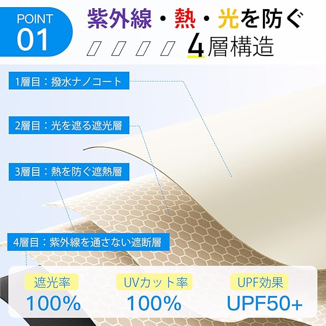 【JIS認証 UVカット率100% & 完全遮光】夏の肌と快適さを守る!遮光率が100%に至り、強力な遮光性で太陽光をしっかりカットし、紫外線を徹底ブロックし、敏感な肌をしっかり保護。特殊コーティング生地が熱を抑え、心地よい涼しさを提供、まるで清涼な木陰にいるような快適さを実現!