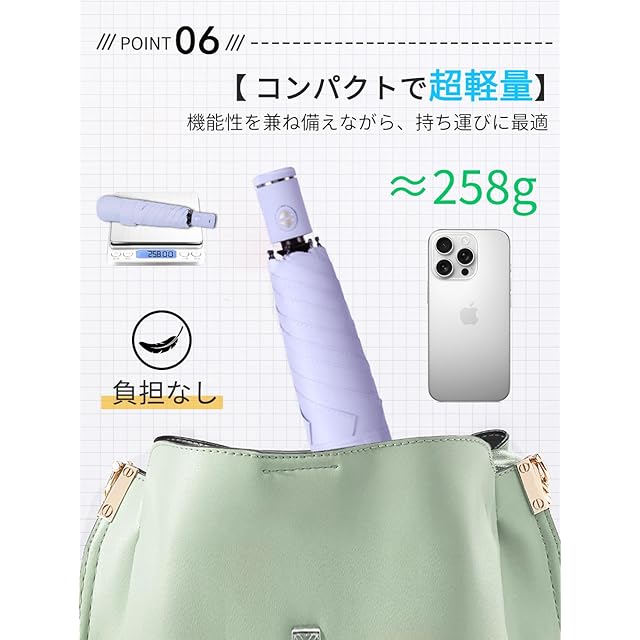 【軽量・コンパクト・携帯便利】折りたたみ日傘はアルミニウム合金とグラスファイバーの骨組みを採用し、屈曲性に富んで、軽量性・携帯性・頑丈さを一気に実現します。開いた状態で直径92cm、収納時は厚さがわずか25×5cmと超薄型で、ポケットにも収まるコンパクトなデザインです。重さは約258gと非常に軽量で、日常的な持ち運びに最適で、邪魔になりません。通勤や通学、旅行、ハイキング、スポーツなど、多様なシーンで利用でき、幅広い世代の方々にご愛用いただいています!