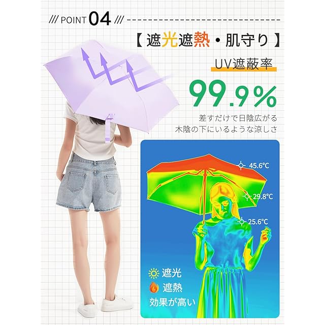 【紫外線対策・遮光遮熱】UPF50+の高い紫外線防止効果を誇り、99.9%の紫外線をシャットアウトします。高密度の傘布と日焼け止めの黒のポリウレタンコーティング加工を組み合わせた、日焼けを防ぐために必要なUVカットの性能を兼ね揃えた、紫外線対策にはピッタリのアイテムとなっています。これにより、真夏でも外出も涼しく快適に過ごせます。この折り畳み傘は夏の必需品で、日差しを気にせず、心地よい時間をお楽しみください!