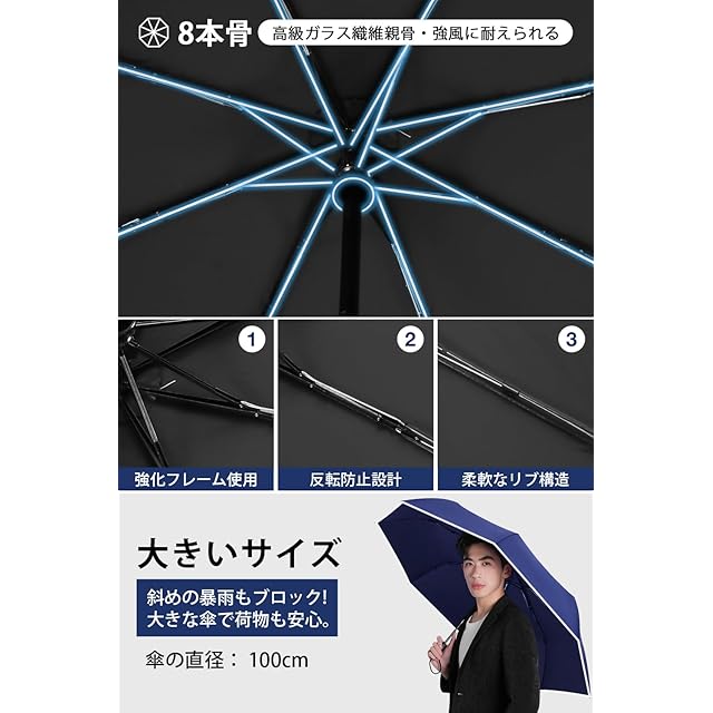 【強風や豪雨に負けない耐久性&高強度な傘骨】頑丈な8本の親骨を採用し、耐風性と耐久性を大幅に向上させた折りたたみ傘です。軽量ながらも頑丈なアルミ素材と壊れにくいグラスファイバーを組み合わせた設計により、普通の傘と比べて横強度が25%アップ!豪雨や強風にも安心してお使いいただけます。さらに、万が一風にあおられて裏返ってしまった場合でも、開閉ボタンを押すだけで簡単に元通りになるので、壊れにくく長く愛用できます。耐久性と安心感を兼ね備えたこの一本、雨の日の強い味方になること間違いなし!