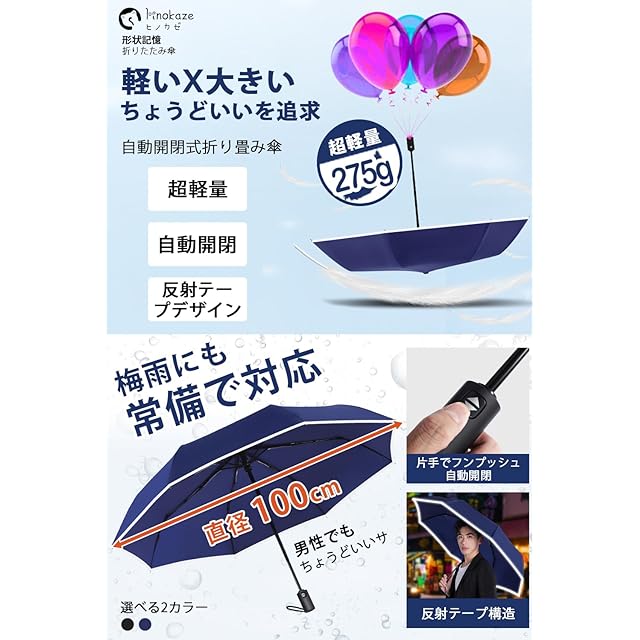 HINOKAZE 折りたたみ傘 ワンタッチ 自動開閉 メンズ【形状記憶・3秒でたためる傘】265g超軽量 8本骨自動開閉 折り畳み傘 おりたたみ メンズ レディース 折りたたみ傘 ワンタッ 撥水速乾 耐強風 男女兼用 携帯しやすい