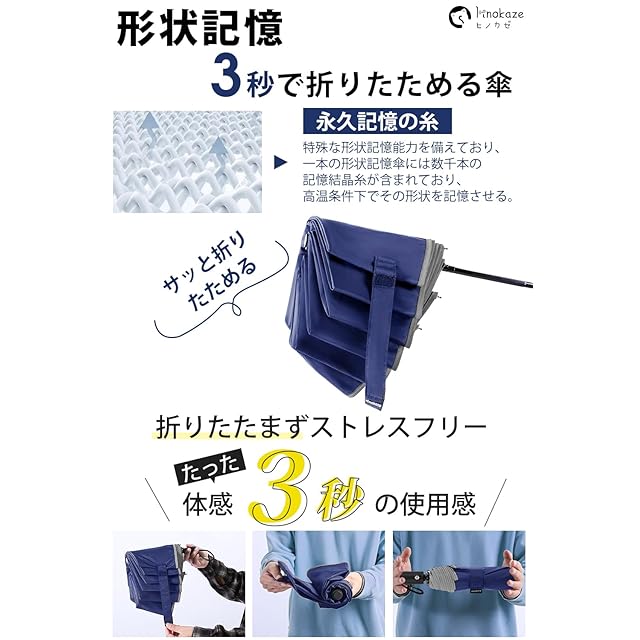 【形状記憶加工傘】折りたたみ傘 形状安定加工を施したこの傘は、わずか3秒でスムーズにたたむことが可能で、忙しい朝や急な雨の日でもストレスなく収納できます。また、収納時にかさばらず美しくまとまるため、カバンの中でも場所を取らずスマートな印象をキープ。一般的な形状安定傘はシートを貼り付けることで重さや剥がれといった問題がありましたが、HINOKAZEの形状安定傘は特殊な熱加工技術で「生地そのもの」に折り目を付けるため、軽さはそのままに半永久的な効果を実現しました。これにより、畳む動作が簡単になり、これまで折りたたみ傘に苦手意識を持っていた方でも気軽にお使いいただけます。