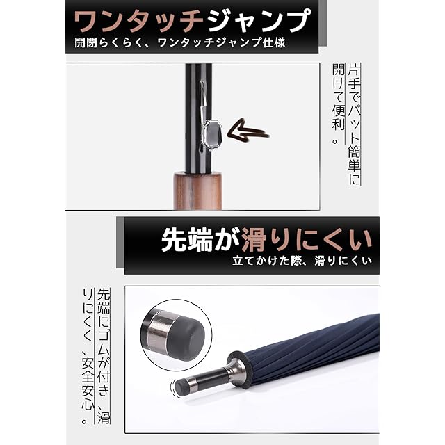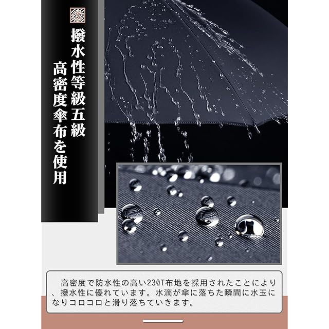 【撥水性等級5級】高密度で防水性の高いの230T防水布地を採用されたことにより、撥水性に優れています。水滴が傘に落ちた瞬間に水玉になりコロコロと滑り落ちていきます。また、汚れ防止の効果も有り、汚れには強い生地となります。丈夫な傘骨に合わせて激しい暴風雨にも対抗でき、水漏れや強風による割れなどの心配が全然有りません。長い間使えます。