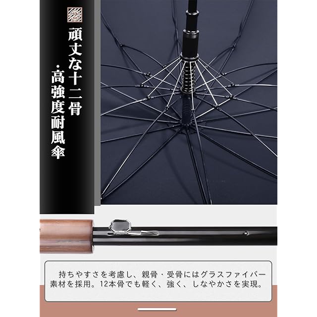 【激しい豪雨&台風対抗の頑丈な12本骨構造】暴風に応対性が強くなるため、骨組みに工夫を凝って頑丈なグラスファイバー製の12本の傘骨を採用しているのおかげで、アルミニウム合金製の傘より優れた耐風性を持っています。強い風でひっくり返っても、開閉スイッチを押したら、骨が曲がることなく、すぐ元通りになります。かなり耐久性に優れ、暴風雨、台風の天候でも容易に割れたり折れたりする心配がありません。耐久性が長くて安心して使える傘になります。