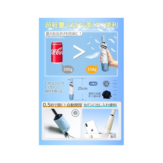 【コンパクト&軽量設計】夏のお出かけを自由に!258gの軽い設計で、持ち歩きがストレスフリー。折り畳めば25cmの巧妙なサイズで、バッグやポケットにスッキリ収納、どこへ行くにも気軽に携帯!サッと広げて瞬時に日差しをカット、使わないときはスマートにしまえる。耐久性も兼ね備え、毎日のお供に最適。