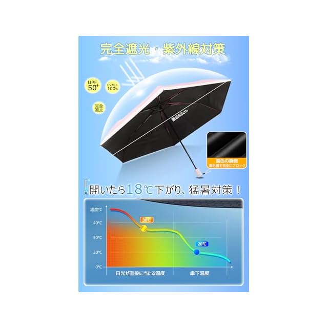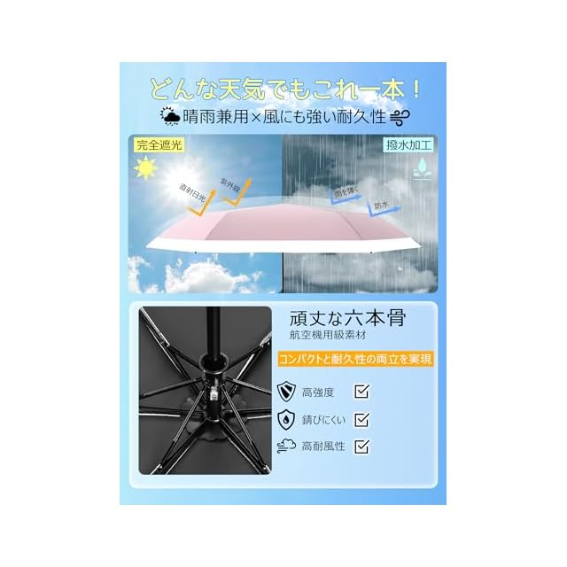 【晴雨兼用&耐風構造】天候を気にせず、自由に出かけよう!晴天では強力な紫外線カットで肌を守り、突然の雨でも頼れる防水性能でサッと対応。航空機用級素材の傘骨は耐腐蚀性に優れ、過酷な天候でも折れにくい驚異の強度と耐久性を発揮。超撥水の生地で雨をしっかり弹く、毎日のお出かけに信頼のパートナー。