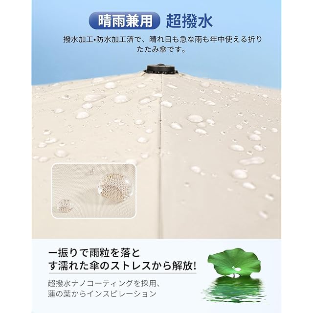 【晴雨兼用☂ 耐風撥水】310T高密度生地が、雨が珠のように丸くなり転がり落ちます。普通の折畳み傘より撥水性が優れ、軽く振るだけで雨水を振り払えます。長い間使用しても雨の染み込みが気にならなくなりました。電車内等の公共の場では人にご迷惑を掛けません。こちらの折りたたみ傘は防汚加工も施されており、汚れに強い生地です。中棒は頑丈航空機用アルミ合金製造。耐久性に優れています。強風で裏返っても元に戻ります。