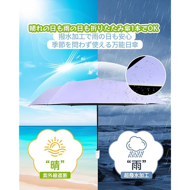 【晴雨兼用でどんな天候にも対応】持ち運びに便利な日傘兼用雨傘の折り畳み傘です、高密度の防水素材を使用した日傘です。 通常の傘よりも耐水性に優れ、軽く振るだけで雨が玉のように一気に落ちるので、他の人の邪魔になることもありません。 センターポールと傘の骨は航空機用アルミニウム合金を採用しており、強度と耐久性に優れている折りたたみ軽量日傘とも言えます。ゲリラ豪雨や突風にも難なく対応できます