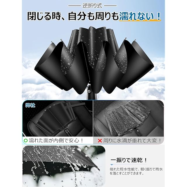 超人気濡れない「逆折り式傘」。☂【濡れない逆折り式傘&カバー付き】通常の傘は濡れた部分が外側になりますが、逆折り式傘は、閉じたときに濡れた部分が内側になるというユニークな傘。手が濡れない傘として大人気です。閉じる際に手が濡れにくく、人混みや電車の中でも、まわりが濡れないように気を遣う必要がないです。衣服・荷物・車のシートなどを濡らしたくないときにも便利です。さらに、高撥水生地を採用し、水をはじきやすく、軽く振るだけで雨水を落とすことができます。カバーや袋付きなので、使用後すぐにカバンに収納できます。ホコリや汚れから傘をガードできるほか、使ったばかりの傘をしまっても服やバッグを濡らしません。より一層便利さが進化した折り畳み傘です。電車やバスなど公共交通機関を利用する方におすすめです。