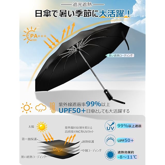 12本超強靭な骨組みで「強化型傘」。☂【12本骨強化型&強風耐久性】様々な意見をまとめて、新作の晴雨兼用傘がようやく登場!男性の方が求める機能を全て取り入れた究極の強化型傘です。柔軟性と強度を併せ持つ12本親骨を採用し、普通の8傘本骨より、耐風性と耐久性ともに向上させた、防食加工が施された傘のフレームは超強靭で錆びにくい上に、強風にあおられても豪雨に打たれても折れたり曲がったりしにくいです。3段折り構造により、強風で裏返ってもちゃんと元に戻ります。安易に折れたり曲がったりする心配ありません。梅雨はもちろん、豪雨、強風にも安心できます。(※通常の傘より少し重いですが、機能を重んじて傘の強度と大きさを求めて作られています。重さに気になる方は何卒ご理解のほどよろしくお願い致します。)