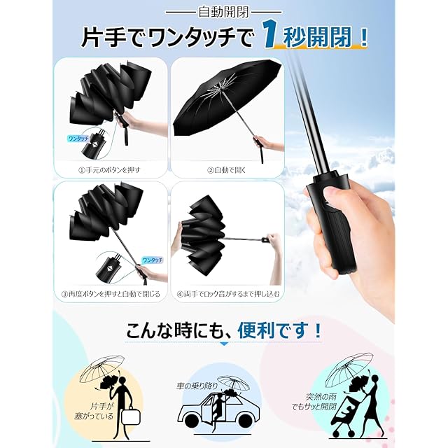 急な雨の際にあると便利な「折りたたみ傘」。☂【ワンタッチ自動開閉&片手で楽!】業界最新な技術を採用されていて、ボタンを押すだけで傘を開いたり閉じたりできます。片手でも簡単に開閉できます。傘を閉じる時に撥ねてくる雨粒で袖が濡れる気まずさにさようなら!突然雨が降り出したけど、傘を開くのに手間取り濡れてしまったという経験がある人も多いのではないでしょうか。ワンタッチ自動開閉式なので、スピーディに開けられます。雨の日の車の乗り降り、子供を抱きかかえている時や荷物の多いときも楽です。外回りの仕事、突然の夕立にもサッと広げる事が出来て、いつでも安心しています。(ご注意:密封することにより少し折りたたみ傘特有のニオイがありますが、健康に影響はございませんので、安心してご使用ください。ニオイが気になる場合は風通しの良い場所に1、2日置いておくとニオイも気にならなくなります。)