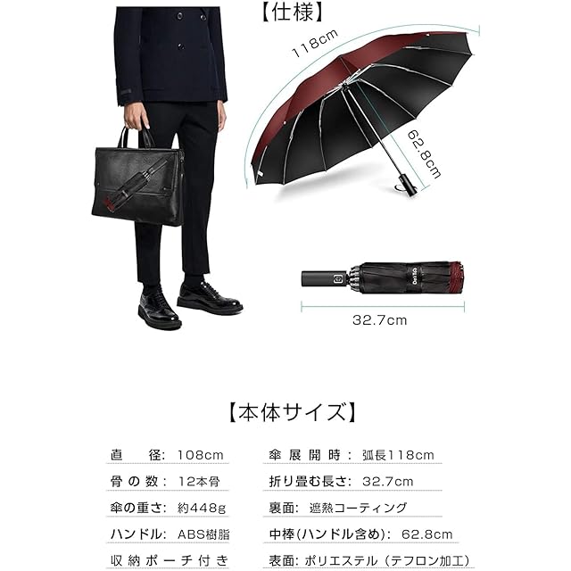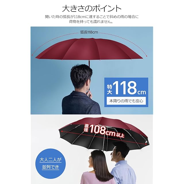 ☂【ビッグサイズメンズ傘】傘を開くと直径約108cm、弧長約118cmと大型化され、大人2人余裕に入れる折り畳み傘です。雨を防げる範囲が大きく、リュックを背負ってもしっかりとカバーされ、体の大きな男性が窮屈さがなく快適です。折りたたんだら全長約32.7cmとなり、通勤用カバンにすっぽり収納でき、カバンや車に常備すれば急な雨にも心配なし。