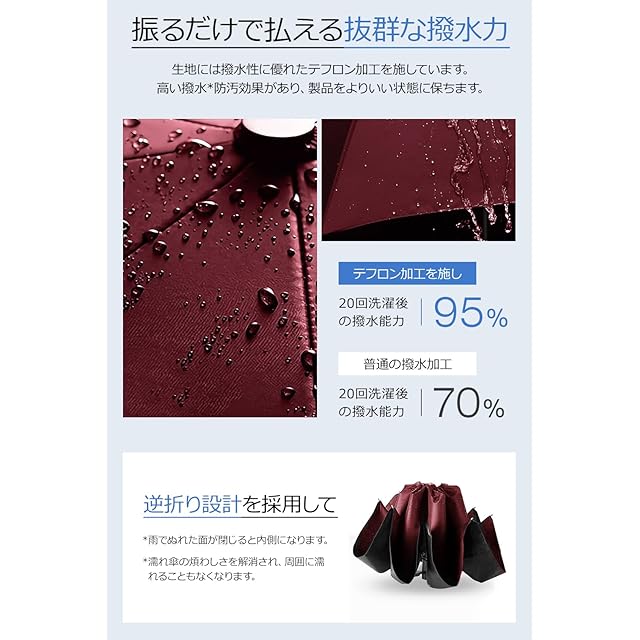 ☂【濡れない逆折り式傘】傘の折りたたみが逆にデザインされ、閉じたときに雨に濡れた部分が内側になるので、水滴が周りに飛び散らない逆折り式折りたたみ傘です。通常の傘と比べ、満員電車やバスに乗っても周りの人に迷惑を掛けず、車やタクシーでも傘についた水滴が席につく心配はなくとても便利な折り畳み傘です。