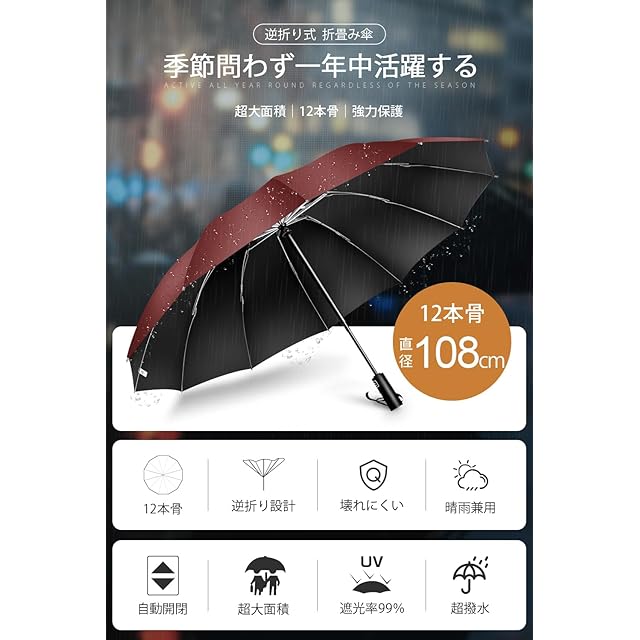 折りたたみ傘 【頑丈な12本骨 逆折り式】 大きいサイズ ワンタッチ 自動開閉 折り畳み傘 メンズ傘 超撥水 Teflon加工 風に強い 梅雨対策 台風対応 豪雨対応 おりたたみ傘 UVカット 紫外線遮蔽 晴雨兼用 耐風傘 メンズ レディース 収納ポーチ付き (ワインレッド)