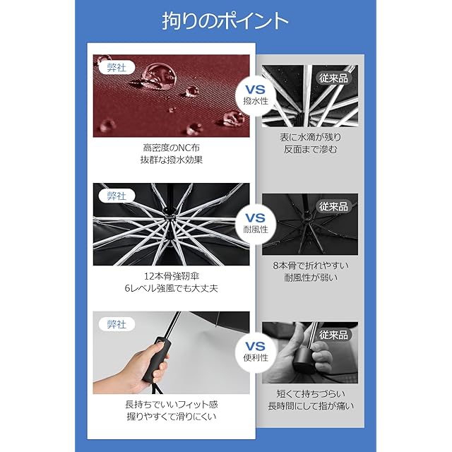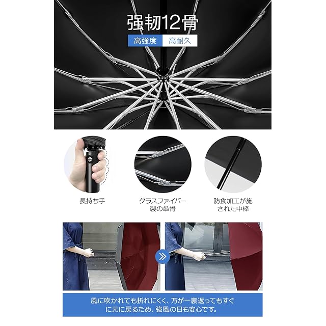 ☂【頑丈な12本骨耐風傘】しなやかで高強度な12本親骨で作られ、耐風性と耐久性ともに向上させ、防食加工が施された傘のフレームは超強靭で錆びにくくて、強風にあおられても豪雨に打たれても簡単に折れない折りたたみ傘です。3段折り構造により、万が一ひっくり返ってしまっても、風の力を受け流し、折りたためばすぐ元に戻ります。梅雨の季節や、豪雨、強風の日にも安心できます。