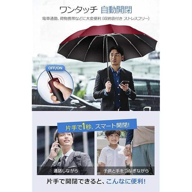 ☂【超撥水・自動開閉式傘】高密度生地で防水性の高いテフロン加工を施され、撥水性に優れた折畳み傘で、生地に付着した雨水が染み込むことなくしっかりと弾いてくれるので、使用後軽く振るだけで水滴を振り払えます。また、ワンタッチ自動開閉傘なので、荷物で手がふさがっている時も、片手でボタンを押すだけでサッと自動開閉できます。車やバスに乗り降りの際に非常に便利です。