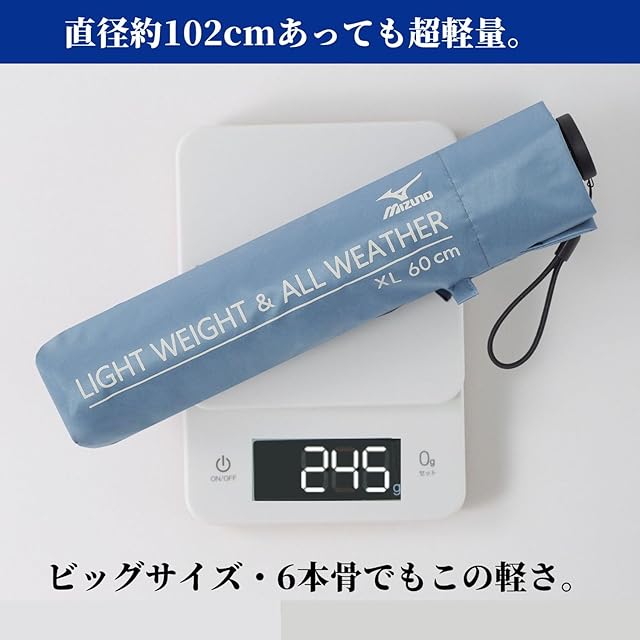 ミズノの軽量の遮光率100%、遮熱効果のある一級遮光の折りたたみ日傘。重さ約245g、細さ4㎝の持ち運びに便利なタイプ。広げたサイズが102㎝と大きいのでしっかりした雨、夏の日差しも防ぐ晴雨兼用の折りたたみ傘。