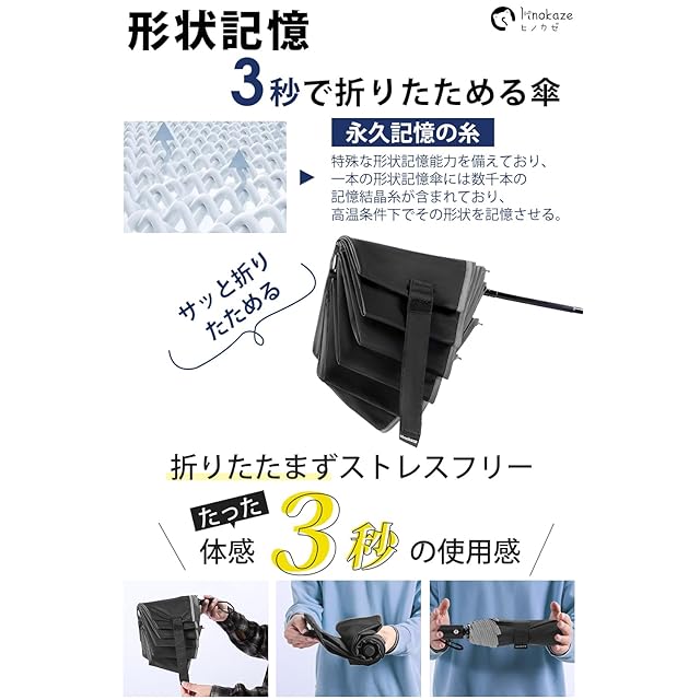 【形状記憶加工傘】折りたたみ傘 形状安定加工を施したこの傘は、わずか3秒でスムーズにたたむことが可能で、忙しい朝や急な雨の日でもストレスなく収納できます。また、収納時にかさばらず美しくまとまるため、カバンの中でも場所を取らずスマートな印象をキープ。一般的な形状安定傘はシートを貼り付けることで重さや剥がれといった問題がありましたが、HINOKAZEの形状安定傘は特殊な熱加工技術で「生地そのもの」に折り目を付けるため、軽さはそのままに半永久的な効果を実現しました。これにより、畳む動作が簡単になり、これまで折りたたみ傘に苦手意識を持っていた方でも気軽にお使いいただけます。