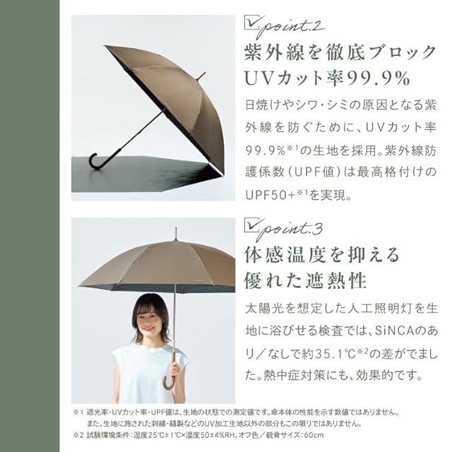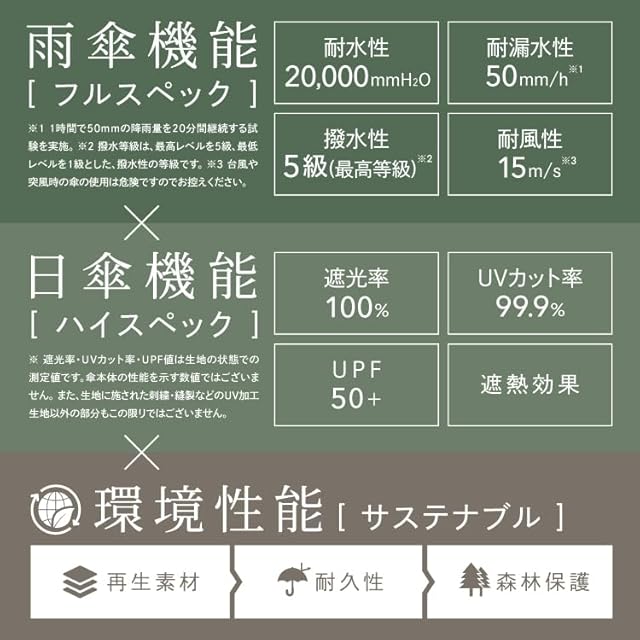 【晴雨兼用】 耐水圧10,000mmH2O以上の高性能生地を使用。 また、生地裏面にポリウレタン樹脂の多層コーティングを施した《遮光率100%、UVカット率99.9%、UPF50+》なので 日傘として必要なスペックもハイレベルで兼ね備えています。