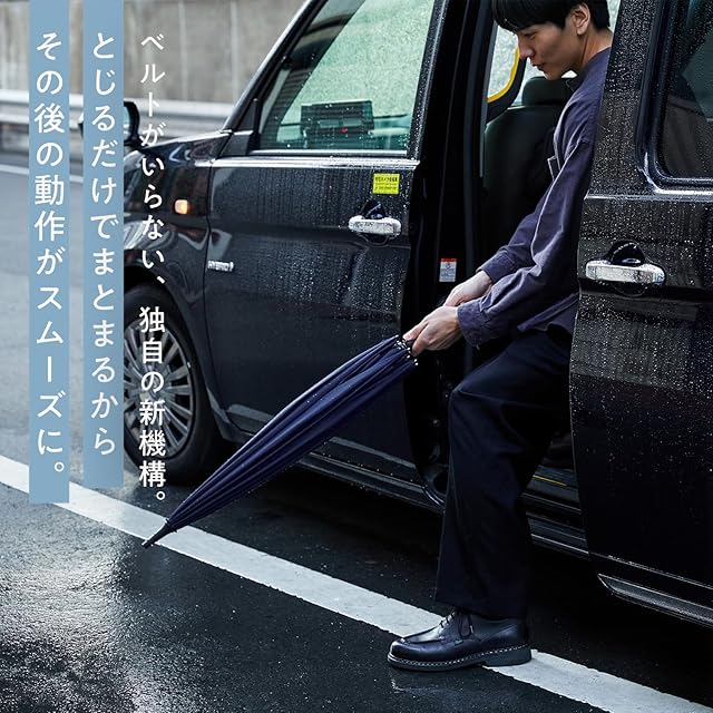 【手を濡らさず、一瞬でまとまる傘】傘をとじたあと、手でまとめて、ベルトで留める。手が濡れてしまうのは、当たりまえ。そんな煩わしさを無くし「たたまなくていい。」「手が濡れない。」を実現。とじるだけで、生地がまとまる新しい傘が生まれました。【ご注意】傘をしまう際は、広げて湿気を十分に取り除いてください。濡れた傘をそのまま保管したり乾燥が不十分なまま収納すると、傘骨が錆びたり生地が変色したり色移りすることがあります。