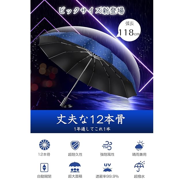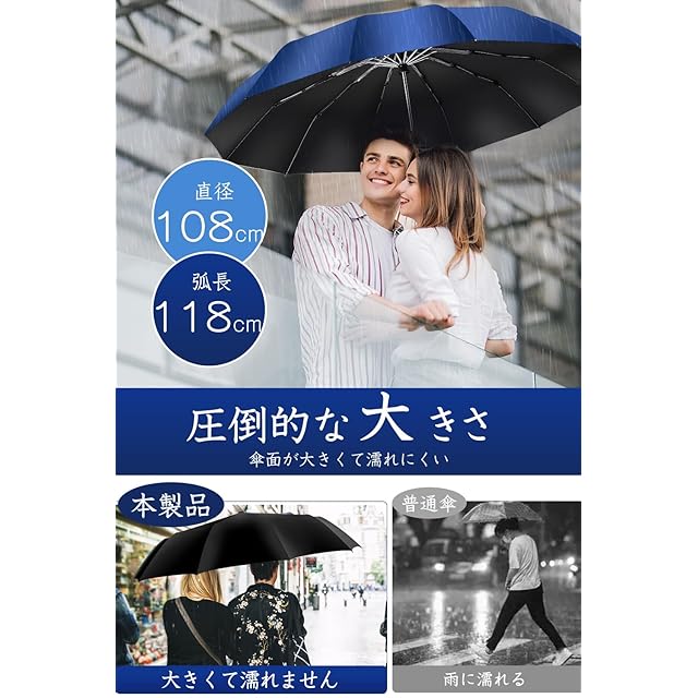 ✅✅【新登場・超特大12本骨設計・強風対応】傘面の曲面長さが118cm、開く直径が108cm、普段の傘より大型化した折りたたみ傘です。 体の大きな男性としても窮屈さを感じることなく快適に使えます。 雨を防げる範囲が大きくので、二人で荷物を持って傘に入っても余裕があるほどの大きさです。梅雨はもちろん、豪雨、強風にも安心できまる12本骨おりたたみ傘です。
