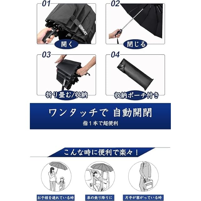 ✅✅【ワンタッチ自動開閉傘】 軽く押すと自動開閉できます。車を降りたり、子供を抱いたり、荷物を持っている時、折り畳み傘は最適です。 折りたたみ式なので出張、旅行の携帯用として、車の中に常備していると大変便利です。 ※ご注意:12本骨ビッグサイズの 折りたたみ傘 ため、約450gの重量があります。重さに気になる方ご理解のほどよろしくお願いいたします。